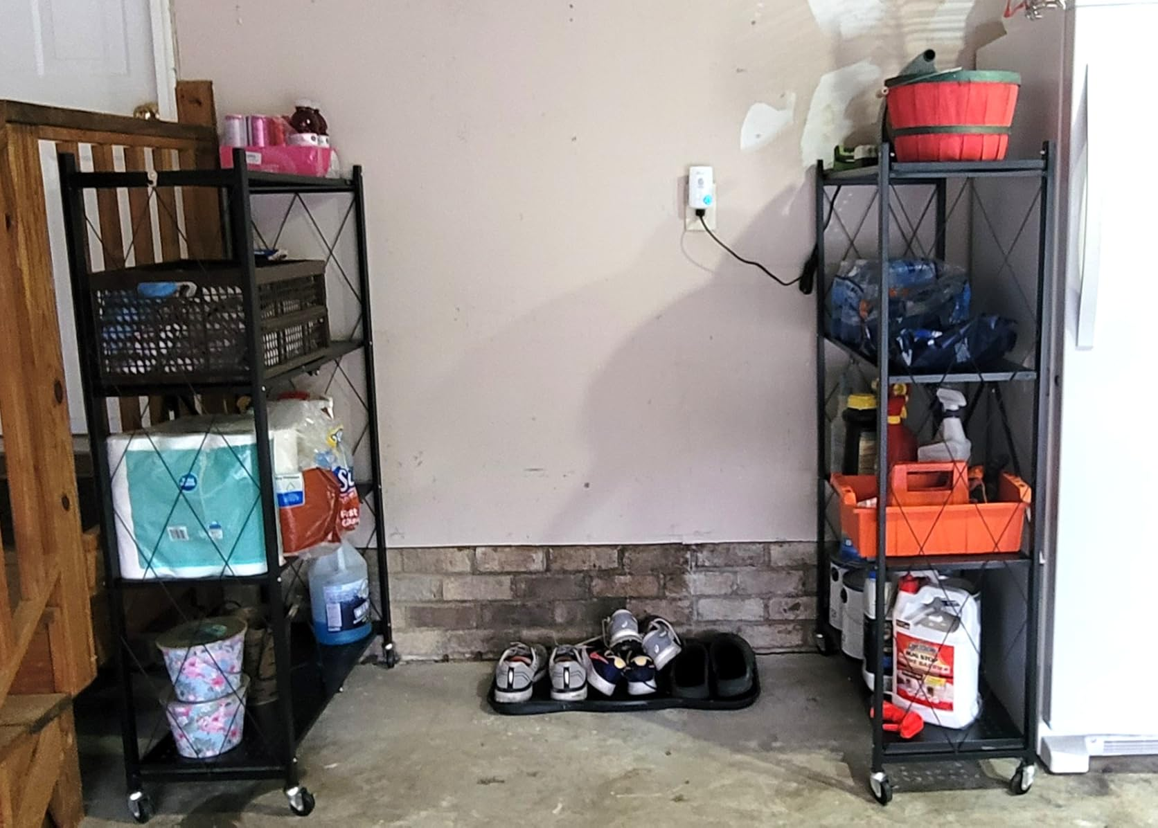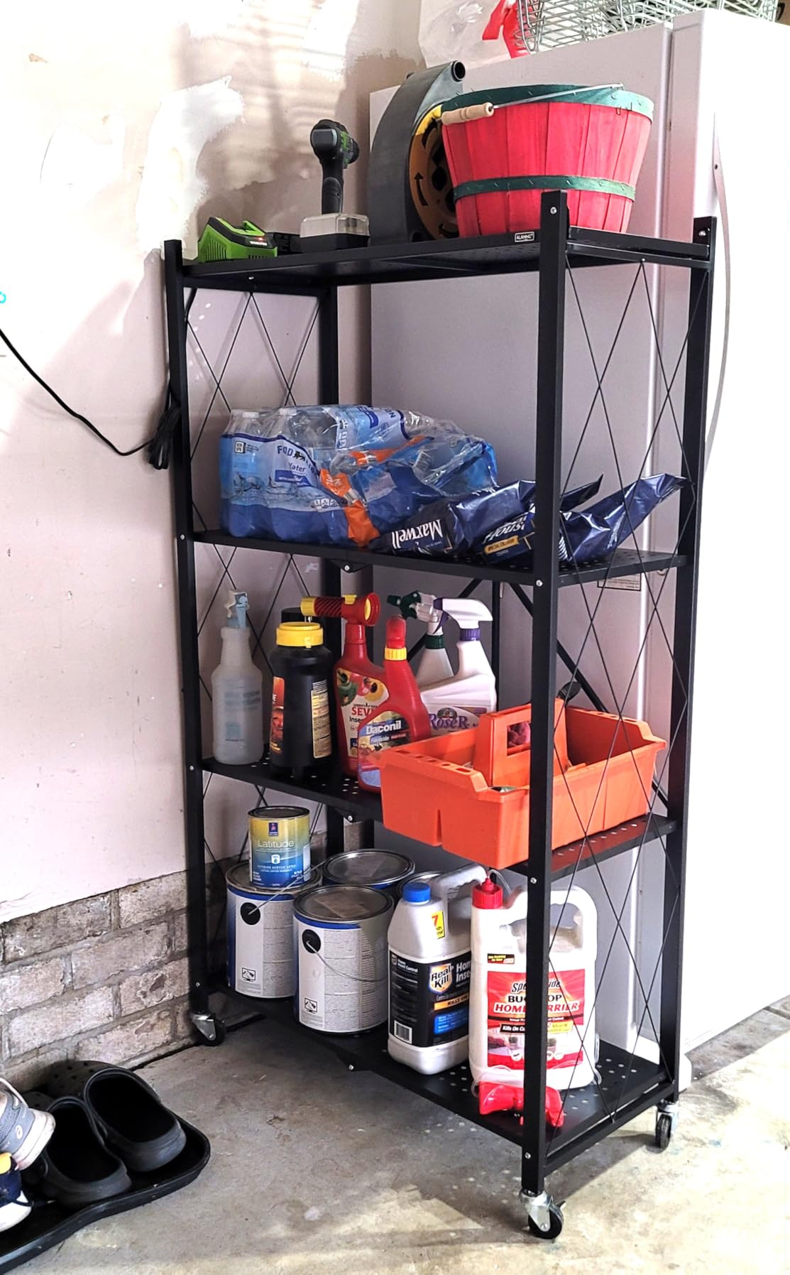 'Easy to assemble, spacious, sturdy shelves; used in garage and closet; added wheels; very convenient, reliable, and durable.'