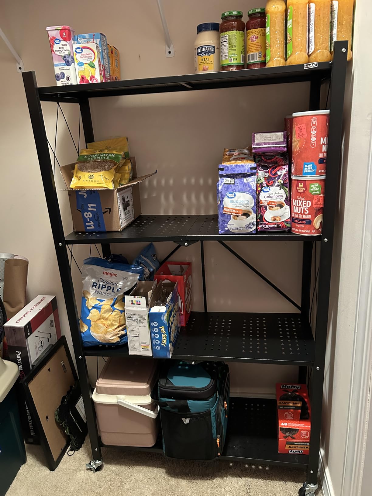 'Excellent foldable shelf on wheels; super easy setup, very sturdy, holds heavy items without sagging; highly recommended.'