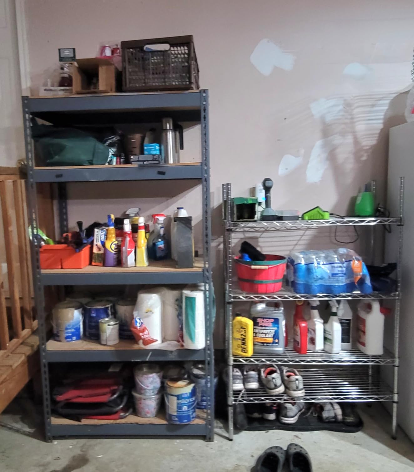 Solid construction as I have paint cans to paper towels stored on the shelves.